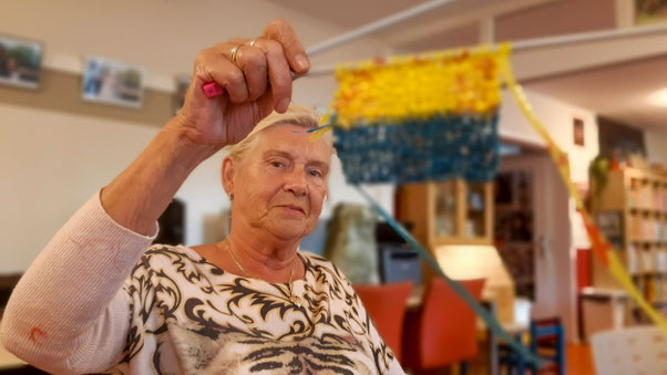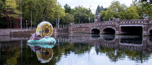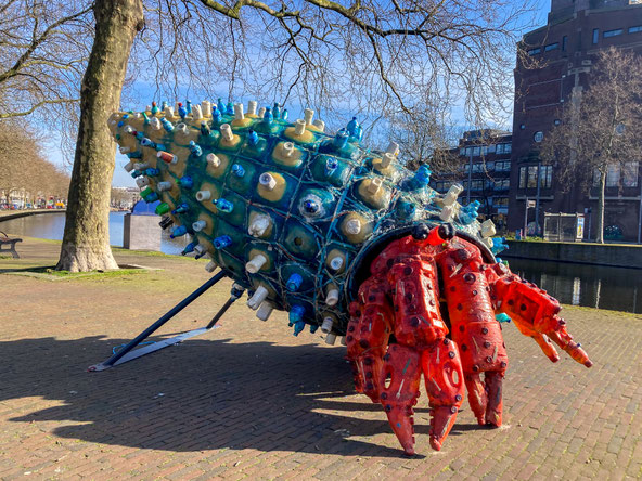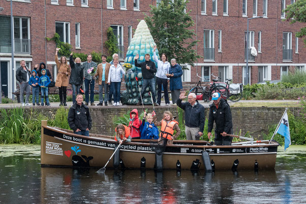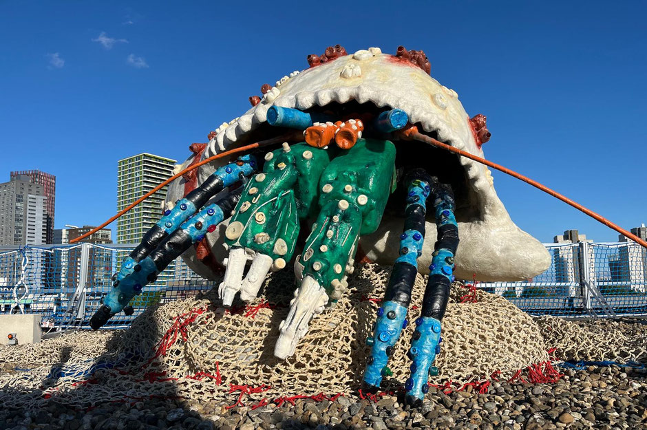Multiple sea creatures are made out of plastic waste. The waste is collected togetjer with inhabitans, out of the rivers and sea.